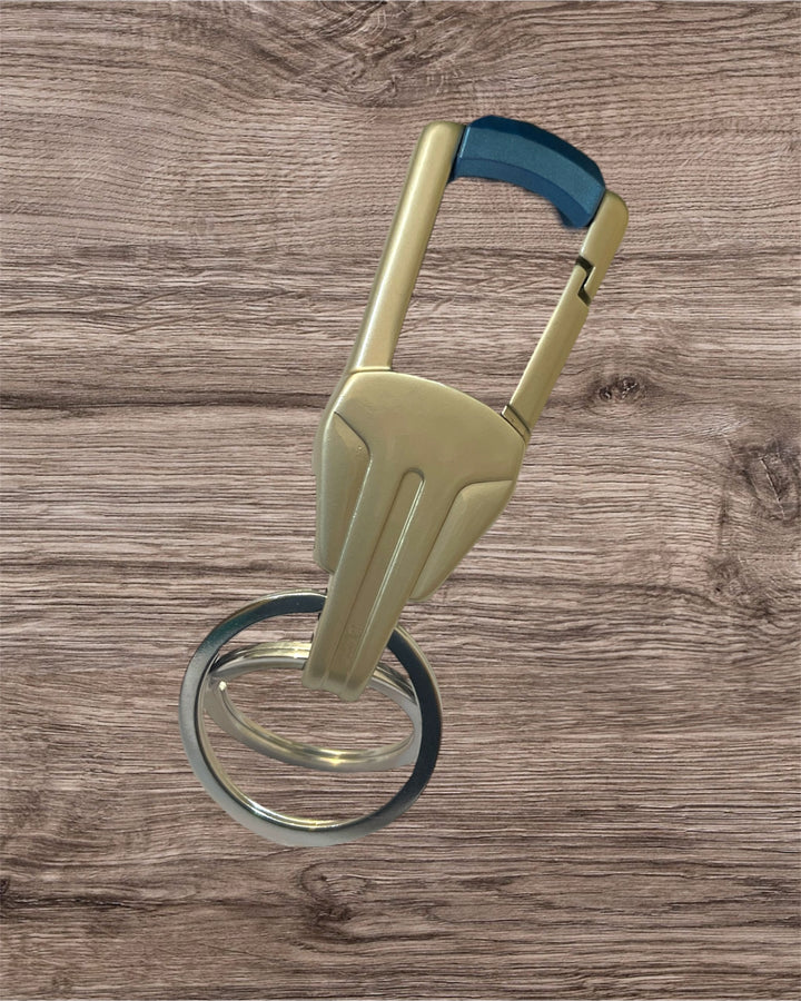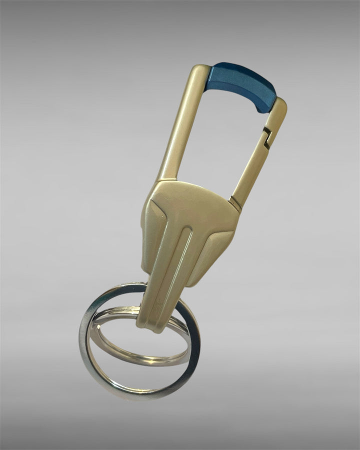 This sleek silver keychain is built for everyday function with a contemporary design. Featuring a durable carabiner-style hook and an ergonomic blue grip, it offers both style and convenience. The dual keyrings make it easy to organize multiple keys, while the secure clasp attaches easily to bags, belts, or loops.